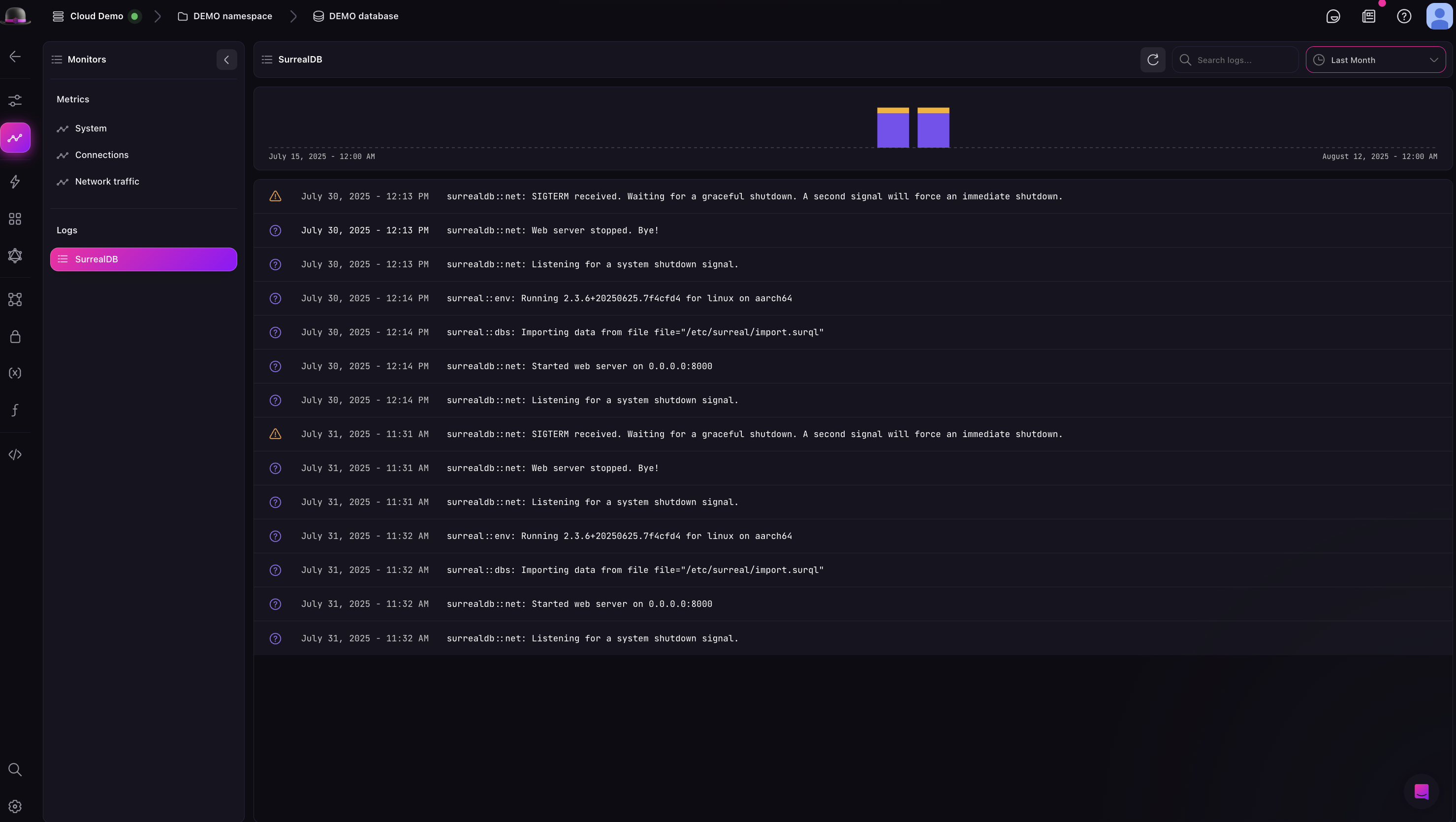 To view the logs of your SurrealDB Cloud Instance, navigate to the monitoring tab in the sidebar. Under the logs option, you will see a list of logs for your SurrealDB Cloud Instance.