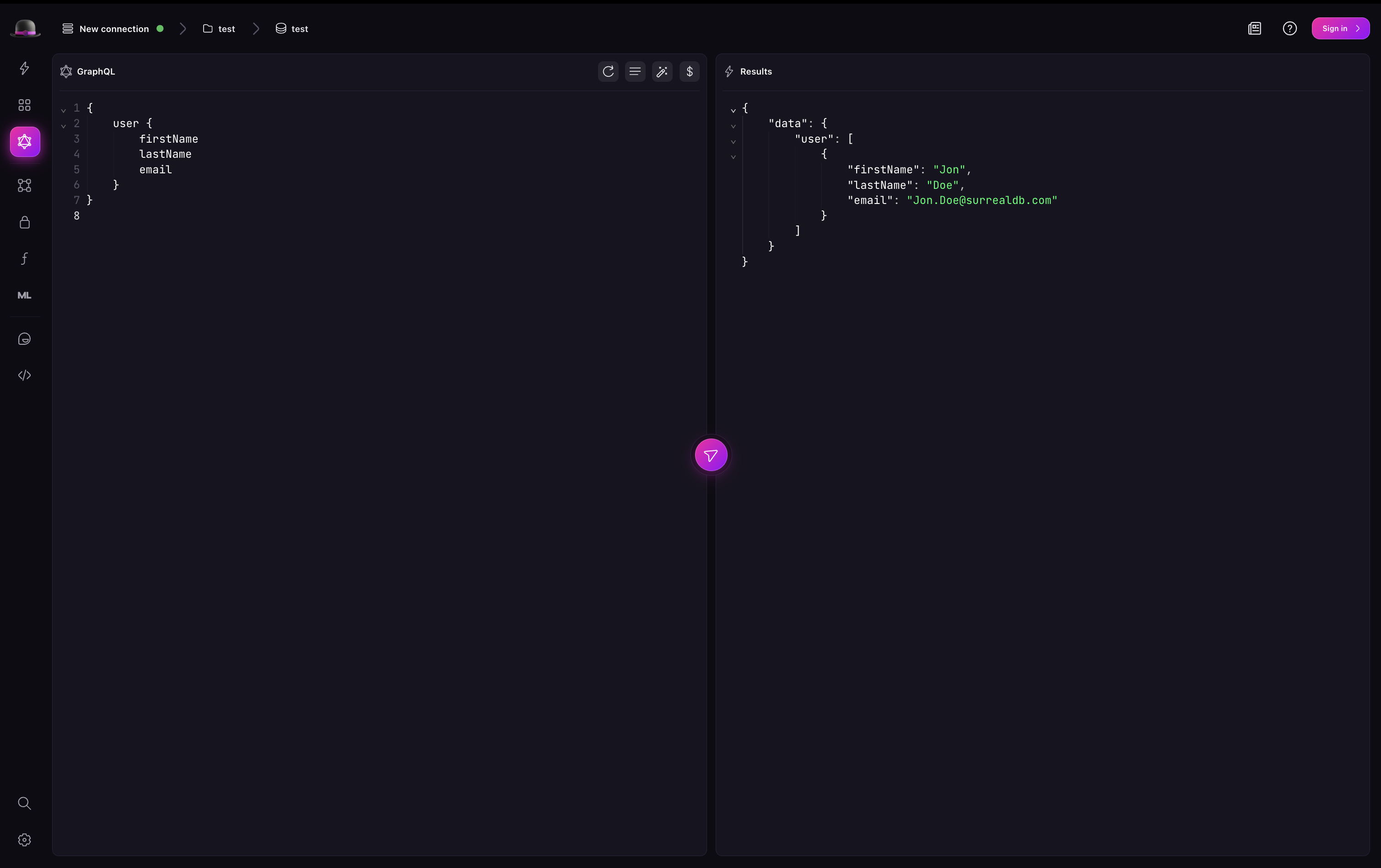 The GraphQL view in Surrealist allows you to write, execute, and visualize GraphQL queries in real-time. You can see the results of your queries in JSON structure returned by GraphQL.